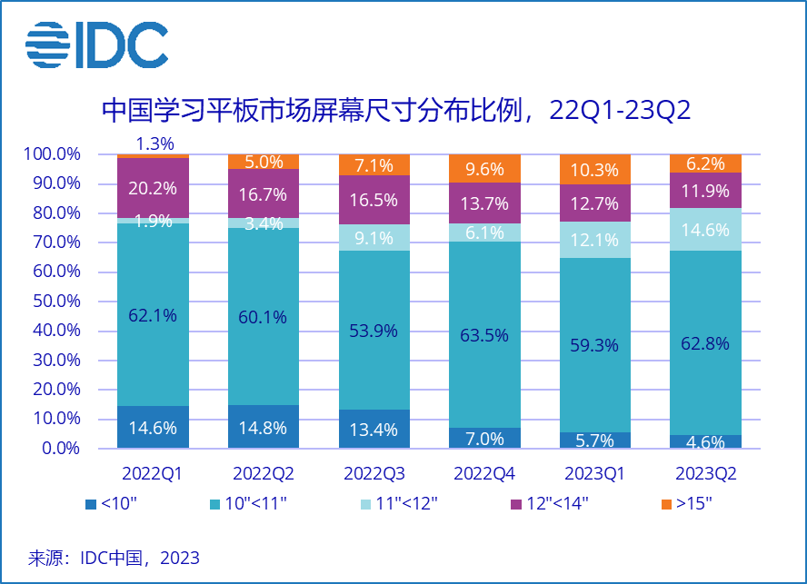 虽然学生平板10至11寸产品商场份额仍然占有主导位置,但值得注意的是,15寸以上产品的商场份额在日益提高,2023年上半年15寸以上产品的商场份额已高达16.5%。大屏化是学生平板未来开展趋势,在功用和内容不断提高的一起,学生家长越来越重视学习平板的护眼功用,因而各大厂商在不断开发大屏学习平板。